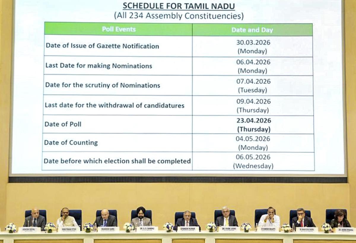 According to the poll body, the election will be conducted in a single phase across all 234 assembly constituencies in Tamil Nadu. The notification for the election will be issued in early April, after which candidates can begin filing their nominations. The last date for filing nominations will fall about a week later, followed by the scrutiny of nomination papers the next day. Candidates will then be allowed a short window to withdraw their nominations.