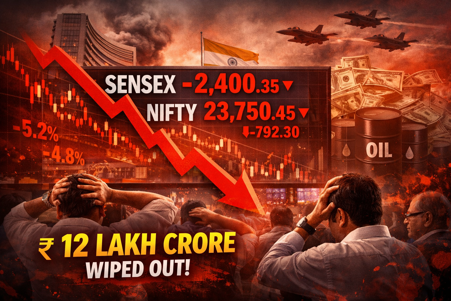 India’s stock markets witnessed a sharp sell-off on Monday, wiping out nearly ₹12 lakh crore in investor wealth in a single trading session. The benchmark indices — the BSE Sensex and Nifty 50 — plunged dramatically as global and domestic concerns triggered widespread panic selling.